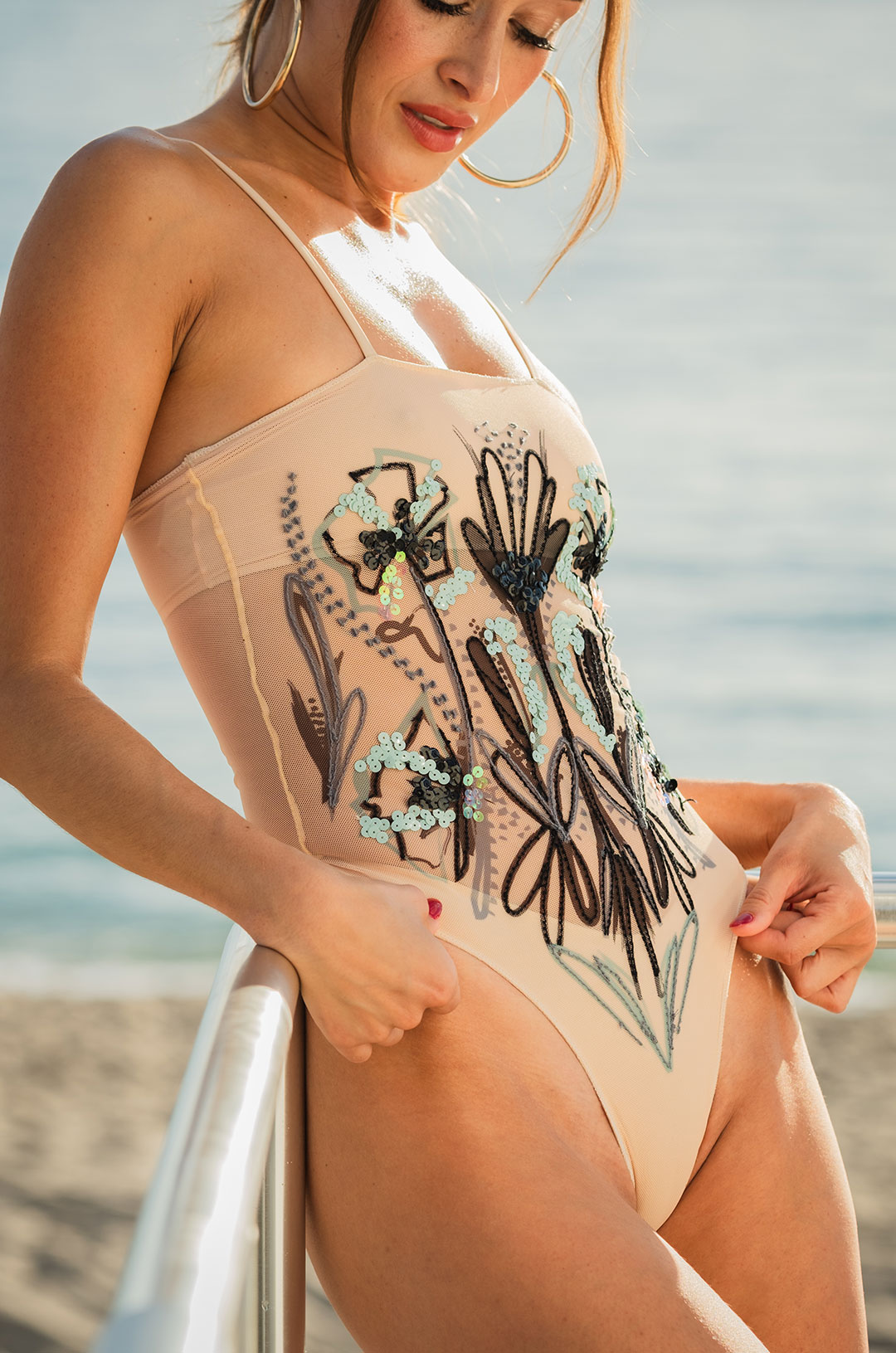 El enterizo Eclipse de Airavata Swimwear está hecho en malla y bordado a mano con formas botánicas que aportan textura, luz y carácter. Con una silueta limpia y detalles pensados, es una pieza que se adapta a diferentes momentos desde una tarde de sol hasta una noche especial.