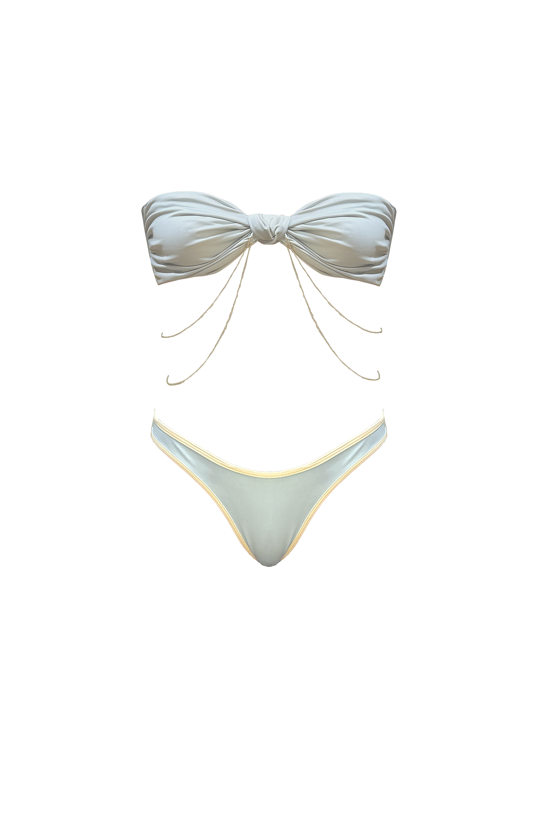 Un bikini bandeau en azul cielo con cadenitas de mostacilla bordadas a mano. Lyra es frescura, textura y brillo sutil. Top con nudo al frente y panty de tiro medio que resalta tu bronceado con elegancia.